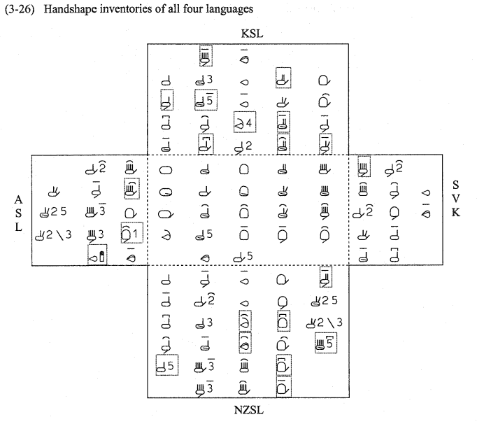 In a comparison between the four unrelated sign languages ASL, KSL, NZSL, and SVK, the handshape inventory sizes ranged from 34 to 49, with an average of 40 and a standard deviation of 7. Among these four languages, 22 handshapes were used in common.